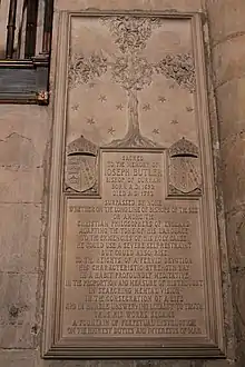 Butler was born on 18 May 1692.[12] The son of a Presbyterian linen draper, Butler was destined for the ministry of that church, and with the future archbishop Thomas Secker, entered Samuel Jones's dissenting academy at Gloucester (later Tewkesbury) for the purpose. There he began a secret correspondence with the Anglican theologian and philosopher Samuel Clarke. In 1714, he decided to join the Church of England and entered Oriel College, Oxford, receiving a Bachelor of Arts degree in 1718 and named a Doctor of Civil Law on 8 December 1733.[1]