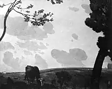 2. "Mr. Pearson's landscape with cattle has this severity. A fine schematism regulates the placing of the planes; the very touch is schematic, consisting of multiplied firm, broad strokes. There is an undeniable vividness in Mr. Pearson's work, and one awaits his development with interest. A certain dryness is clearly his danger. Yet so soundly constructed is the landscape which won the Jessie Sesnan medal that it could be hung by those Paul Potters which it distantly recalls."[15]