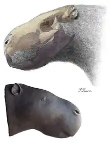 J. monesi is the only species for which the skull has been identified. Its skull is massive, measuring 53 cm (1 ft 9 in) in length.[1] For comparison, in a 2007 study, a sample of 110 beef cows belonging to 9 different breeds had a maximum head length of 52.8 cm (1 ft 9 in).[13] Its skull is 65% bigger than the skull size of the previous largest identified rodent, Phoberomys pattersoni.[14]