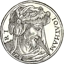 Jotham or Yotam (Hebrew: יוֹתָם, Modern: Yōtam, Tiberian: Yōṯām; Greek: Ιωαθαμ, romanized: Ioatham; Latin: Joatham)[1] was the eleventh king of Judah, and son of King Uzziah and Jerusha (or Jerushah), daughter of Zadok. Jotham was 25 years old when he began his reign, and he reigned for 16 years.[2] Edwin R. Thiele concluded that his reign commenced as a coregency with his father, which lasted for 11 years. Because his father Uzziah was afflicted with tzaraath after he went into the Temple to burn incense, Jotham became governor of the palace and the land at that time, i.e. coregent, while his father lived in a separate house as a leper.