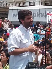 As a student, he was president of the Simón Bolívar University student union.[4] As a candidate for the National Assembly, with Freddy Guevara, he emphasized the role of student protests against Venezuela's President, Nicolás Maduro.[5]