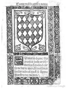 Juan Andres is the writer of the book Sumario breue d'la pratica d'la arithmetica d'todo el curso de larte mercantivol bien declarado.[2] The book, as it is stated in the last page, was written in Zaragoza in 1514 and printed in Valencia in 1515 by the printer Joan Joffre. The book is devoted to D. Serafin, earl of La Oliva and lord of Nules and Pego.