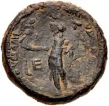 After their murder, all images of Empress Milonia and young Drusilla Minor were destroyed in hopes of making people forget they ever existed, as a sort of damnatio memoriae. Although these once did exist, no sculptures of Milonia and Drusilla survive.[11] Although other, more powerful motives caused the deaths of her parents, Drusilla's murder was only justified by her paternity: as Caligula's only legitimate child, she could have claimed the throne for her descendants or even for herself.[11] The only surviving image of Drusilla is a coin issued by Herod Agrippa the Great, King of the Jews, that represents Drusilla as a small child sitting next to Victory. The coin reads "to Drusilla, daughter of Augustus."[12][13]