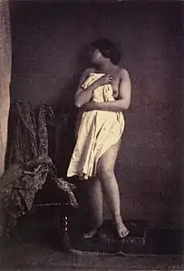 From 1842 de Villeneuve took up photography, not long after its invention, as an adjunct and aid to his graphic work,[3] producing some daguerreotypes but predominantly softly toned salted paper prints[4] from paper negatives that enabled the retouching he employed for artistic effect. Following the method of Humbert de Molard, he fixed his prints with ammonia which avoided the bleaching of highlights caused in salt prints by hypo, and thus incidentally ensured the archival permanence of his prints, which survive today.[5] He had many of his prints made by photolithographer Rose-Joseph Lemercier (1803–1887). In 1850 de Villeneuve opened a photographic studio at 18 Rue Bleue, Paris, where his subjects were 'academic studies',[6] small prints of nudes as models for artists. He printed a series of these studies as 'Etudes d’apres nature',[7] and many were published in La Lumiere, journal of the Society Francaise de la Photographie.[8] There was also a ready market for his photographs of well-known actors in full costume posing against theatrical scenery.[9]