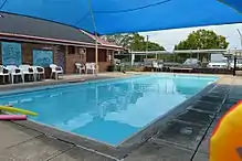 The swimming pool complex includes two rectangular, in-ground, concrete swimming pools and timber stands. The 1929 pool has slightly rounded corners. The complex is enclosed by early face brick and perforated concrete block walls to the south and east, a corrugated metal-clad timber-framed fence to the north, and a recent, face brick, changing room structure (2003, not significant) to the west. The oldest and smallest pool is the 1910 swimming pool, which runs on a north–south axis, measures 13 by 4.9 metres (43 ft × 16 ft), and is located west of the perpendicular, 1929 swimming pool, which measures 23 by 7.6 metres (75 ft × 25 ft). Both pools have tiled edges and concrete pavers around them. The stands comprise tiered, timber-framed seating that allow for the viewing of the 1929 swimming pool. The stands are sheltered by a metal-framed roof (1989) that is not of cultural heritage significance.[1]