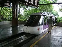 The system was planned by Swiss engineering company Vonroll Transport Systems and construction began in November 1990.[2][4] Its viaducts were painted in green to blend in with the natural environment. It was budgeted at S$18 million (US$9.93 million) with a stipulated opening date in September 1991.[2] An unveiling ceremony for the trains was held on 16 September 1991.[4] The system was also announced as a "panorail", a portmanteau of "panoramic" and "rail".[4] It was launched by President Wee Kim Wee on 11 April 1992, the 21st anniversary of the park.[5][6]