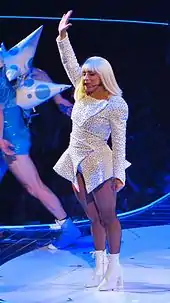 On February 5, 2017, Gaga performed "Just Dance" during the Super Bowl LI halftime show.[85] She was wearing a spicy gold jacket and played on a keytar, while one of her dancers held the microphone for her.[86][87] In the same year, the song was added to the setlist of Gaga's two shows at the Coachella Festival, where she was one of the headliners.[88] On the Joanne World Tour (2017–2018), Gaga wore a pearl-encrusted pale blue bodysuit with dramatic shoulder pads, and knee-high lace up boots while performing the track.[89][90] "Just Dance" served as the opening song of the singer's Las Vegas residency, Enigma (2018–2020). During the performance, Gaga descends from the ceiling in a harness and a sequined jumpsuit while playing on a keytar.[91] In 2022, the singer performed "Just Dance" at The Chromatica Ball stadium tour.[92]