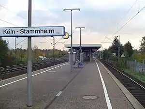 Köln-Stammheim is a railway station situated at Stammheim, Cologne in western Germany.[5] It is served by the S6 line of the Rhine-Ruhr S-Bahn at 20-minute intervals.[6][7] The station is located on a bridge over the L101 Dunnwalder Kommunalweg road.
