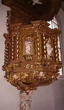 On the nave's south wall is found the pulpit from about 1708. It is likewise one of Johann Lauter's works. The white figures of the four Evangelists on the pulpit stage arise from the dark background. The pulpit canopy is crowned by the shape of Saint George on a pedestal. The stage itself is borne by an angel crowned with flowers, on his shoulders.