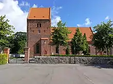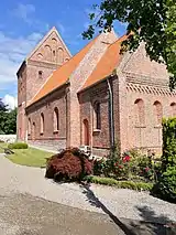 The chancel and nave are built in red brick. The east gable has corner lesenes and contains three bricked-in arched windows topped by an arch frieze. Both the original doors to the north and south, as well as a third door for the priest in the south wall of the chancel, have been bricked up. The gables of the Late Gothic tower were rebuilt in connection with a renovation of the church in 1863. An earlier pyramidical tower was also removed at this point, and the windows in the flank walls were enlarged.[2]