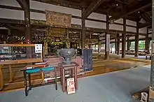 The Sanmon's second floor contains several statues, the most important of which are the so-called Shaka Sanzon (釈迦三尊), or Shakyamuni Trinity, three statues which represent Shaka, Monju Bosatsu and Fugen Bosatsu.[3] (The statue of Fugen Bosatsu has however been lost).[1] The so-called Shi Tennō, or Four Heavenly Kings (Deva Kings) are statues of four protector gods.[3] These are accompanied by the Sixteen Arhats (十六羅漢).[3] All the statues were built during the late Edo period.