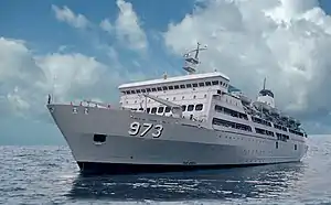 As a passenger ferry, the ship had accommodation for 100 first class, 200 second class, 300 third class, 472 fourth class and 500 economy class passengers. As a troop ship, she had a complement of 119 personnel, and was able to carry up to 2000 troops and was equipped with two Rheinmetall Mk 20 Rh-202 in single mount.[3] The ship also had VIP and VVIP facilities for head of state and other high-ranking officials,[3] consisted of three VVIP rooms, twelve VIP rooms, meeting room, dining room and entertainment lounge.[4]