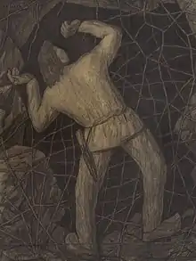 In Estonian (mainly East Estonian) legends, Kalevipoeg carries stones or throws them at enemies, and also uses planks edgewise as weapons, following the advice of a hedgehog.[3] He also forms surface structures on landscape and bodies of water and builds towns. He walks through deep water. Kalevipoeg eventually dies after his feet are cut off by his own sword owing to his own prior—and fatally ambiguous—instructions.