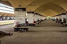 According to the statistics of 2014, the number of homeless people in Dhaka is at least 7 thousand. Many of them live in Kamalapur railway station because of lack of means. Today it is one of the refuges of the destitute population in the city.[63] This unguarded railway station building is the target of criminal activities of vagrants. According to the information of the detective branch, various criminals are waiting to commit misdeeds at this railway terminal and hence the station is dangerous for passengers. According to Railway Police data, 86 criminals were arrested from the terminal in 2021.[64] This is also a safe place for drug dealers.[65] In 2022, Newsbangla24.com reported that there is a lack of security at the terminal and a lack of police personnel can be seen after the evening. The reporter saw some people taking drugs in public and interviewed a porter who was there revealed that the policemen are removed after 12:00 am. On the other hand, the railway police authority blamed the lack of manpower for this insecurity in the station.[66]