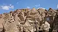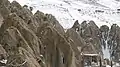 The village exemplifies manmade cliff dwellings which are still inhabited. The troglodyte homes, excavated inside volcanic rocks similar to dwellings in the Turkish region of Cappadocia, are locally called Karaan.[3] Karaans were cut into non-welded ignimbrites, also called "ash-flow tuffs," of Mount Sahand. The cone form of the houses is the result of the erosion of ignimbrite layers consisting of porous, round and angular pumice together with other volcanic particles that were positioned in a grey, acidic matrix. During the eruption of Sahand, pyroclastic flows formed the rocks of Kandovan. Around the village the thickness of this formation exceeds 100 metres (330 ft) and with time, due to water erosion, the cone-shaped cliffs were formed.[4]