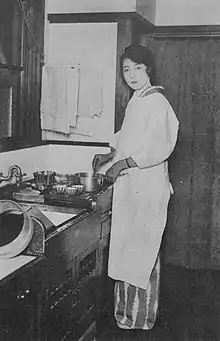 Countess Kiyosu Atsuko wearing a kappōgi in kitchen 1920s