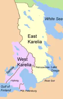 East Karelia and West Karelia with 1939 and 1940–1947 borders. They are also known as Russian Karelia and Finnish Karelia, respectively.