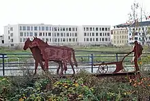 There is a large open space along the northern side of the street between King-Albert-Bridge and Giesserstrasse which is called Jahrtausendfeld (Litt.: millennium field). It was only created in 1999 when the former VEB Bodenbearbeitungsgerätewerk Leipzig (Litt.: soil processing equipment factory), formerly Rudolph Sack agricultural machinery factory, was demolished. On the occasion of Expo 2000 there was an art intervention with disseminating rye which is recalled by the installation ″Man and horses on millennium field″.[20]