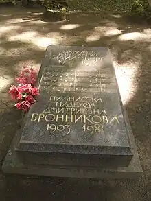 In 1978 Eliasberg died, almost forgotten, and his ashes were buried in a small plot at the back of the Piskaryovskoye Memorial Cemetery.[8] After the fall of Communism, Yuri Temirkanov led a resurrection of Eliasberg's reputation and mayor Anatoly Sobchak arranged for Eliasberg's ashes to be moved to a more suitable grave among the Literatorskie Mostki at the Volkovo Cemetery.[9]