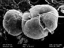| Scanning electron microscope image of Karlodinium veneficum (right) feeding on Rhodomonas | |