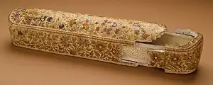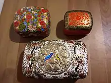 Kashmiri papier-mâché is a handicraft of Kashmir that was brought by Muslim saint Mir Sayyid Ali Hamadani from Persia in the 14th century to medieval India. It is based primarily on paper pulp, and is a richly decorated, colourful artifact; generally in the form of vases, bowls, or cups (with and without metal rims), boxes, trays, bases of lamps, and many other small objects. These are made in homes, and workshops, in Srinagar, and other parts of the Kashmir Valley, and are marketed primarily within India, although there is a significant international market.[1][2][3] The product is protected under the Geographic Indication Act 1999 of Government of India, and was registered by the Controller General of Patents Designs and Trademarks during the period from April 2011 to March 2012 under the title "Kashmir Paper Machie".[4]