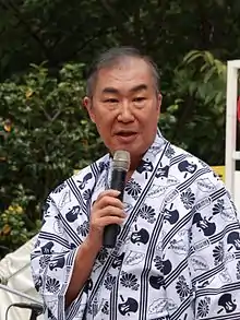 Shizuya Kawamura (河村 靜也, Kawamura Shizuya), known by his stage name Katsura Bunshi VI (六代 桂 文枝, Rokudai Katsura Bunshi), is a Japanese TV presenter and rakugo artist.