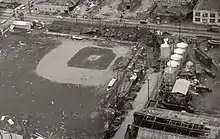 - In 1954, the park re-opened for baseball, having been completely rebuilt after the previous year's tornado. This photo shows the new grandstands.