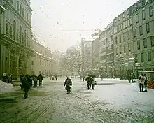 With an average of 12,975 passers-by per hour (as of 5 May 2011), Kaufingerstraße is one of the top-selling shopping streets in Germany. The rental and construction site purchase prices are the highest in the Kaufingerstraße than in any other street in Germany. Rental prices are around 300 € and site purchase prices around 50,000 € per square meter (in 2008). In 2008, the street was one of the 10 shopping miles (9th place) with the highest rents in the world.[1] In 2010, it was, with 11.905 passers-by per hour, in third place of the busiest shopping streets in Germany.[2] In 2011, the Kaufingerstraße slipped to number 4 of the most visited shopping streets in Germany behind the Zeil in Frankfurt am Main (13,035 passers-by per hour). Meanwhile, the Neuhauser road placed second in the list. According to a study by Jones Lang LaSalle (JLL), it was the busiest street in Munich with 13,515 passers-by per hour on the deadline. Also in 2013, the Neuhauser Straße placed second with 11,920 passers-by, this time behind the Dortmunder Westenhellweg (12,950 passers-by).[3] Because of this, Munich is the only German city, which has 2 shopping streets in the list of the most visited five.[4] According to an analysis by JLL from the year 2015, Kaufingerstraße is the most expensive shopping street in Germany with a top rent of 360 Euro per square meter.[5]