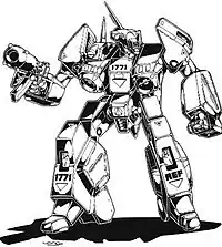 Illustration of a Veritech Alpha Fighter in battloid mode, from The Robotech Role-Playing Game Book Five: The Invid Invasion (May 1988).