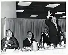 In the fourth month of White's first term, on April 4, 1968, Martin Luther King Jr. was assassinated, touching off disturbances in the African-American Roxbury section of Boston that same evening which did not spread to other parts of the city.[15] On April 5, 5,000 people marched from Boston Common to Post Office Square in King's memory.[16] James Brown had a previously scheduled concert set for that same evening in Boston Garden.[6] White's chief of police was concerned about allowing 15,000 people to attend the concert so close to downtown, saying he didn't think he could keep the city safe.[15] White originally intended to cancel the concert entirely. However, Tom Atkins, a local NAACP leader who had been elected to the City Council from Roxbury in the same election as White 1967 warned of potential rioting if concertgoers arriving at the arena found it canceled. Atkins and members of White's staff persuaded White to allow the show to go on.[9][15][16]
