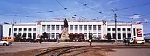 The first station building was built on November 1, 1897. It represented a typical one-story wooden building with an area of about one hundred square meters.[3] In December 1921, it burned down as a result of the panic evacuation of parts of the People's Revolutionary Army of the Far Eastern Republic from Khabarovsk. A new one-story stone building in the Russian Revival architecture was built in November 1926, and the entire station complex was completed in 1935. The construction of the new building on the pre-revolutionary project - an exceptional case in the history of architecture of the Soviet period.[4] The station room for passenger service was insufficient. The building was designed to stay 700 passengers per day, but sometimes more than 1500 people used this station per day. The approach to the trains was carried out directly through the tracks, which, while simultaneously stopping several trains, created inconveniences. The project for the reconstruction of the station was sent to the Ministry of Railways in 1956, but this issue was not implemented. In 1963, the reconstruction of the station began, completed by 1966. The main station building was built a reinforced concrete two-story building in the style of functionalism. An underground pedestrian to go to platforms was built. In March 2000, reconstruction of building was begun, completed in 2007 - the two-story building was turned into a three-story building. As a result of the reconstruction, the building acquired a new architectural look - in the style of Russian modern. Reconstruction of the station complex cost more than 670 million rubles. Ten thousand people can use new station, and almost three million passengers a year.