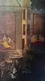 In the meantime, people began exchanging culture and art with European countries. Color materials also began to be imported from abroad. Thus the painting in this period became more vivid and colorful. Khrua In Khong, however, still remained using low saturation, bright objects among dimmed gray and dark background colors. Khrua In Khong was famous for his use of monochromic colors that give harmonious satisfaction, unlike complementary colors. He often used dark shades of blue and green along with light shades of blue, pink and white and avoided contrasting colors. He painted the background with dark colors, male outfits with dark blue and white, while female dresses were light blue or pink making the figures look soft and gentle among shady background that appears like a dreamy landscape.[3][9][10]