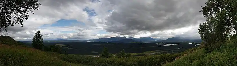 Panorama taken from close to the furthest southeastern extension of the Kichatna Mountain range, showing Skwentna River.
