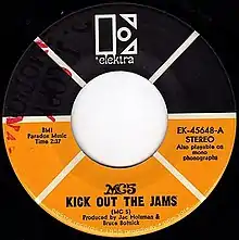 "Kick Out the Jams" is a song by MC5, released as a single in March 1969 by Elektra Records. The album of the same name caused some controversy due to inflammatory liner notes by the band's manager, John Sinclair, and the track's rallying cry of "Kick out the jams, motherfuckers!". According to guitarist Wayne Kramer, the band recorded this as "Kick out the jams, brothers and sisters!" for the single released for radio play; lead vocalist Rob Tyner claimed this was done without group consensus.[3] The edited version also appeared in some LP copies, which also withdrew Sinclair's excitable comments. The album was released in January 1969; reviews were mixed, but the album was relatively successful, quickly selling over 100,000 copies and peaking at #30 on the Billboard album chart in May 1969 during a 23-week stay.
