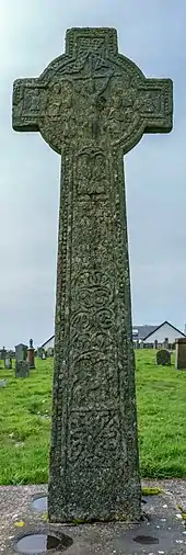 The settlement of Kilchoman consists of a small number of houses gathered around the 19th century church, a short way above the beach and dunes of Machir Bay, "locally known as Kilchoman Beach or Machrie Beach."[1] The site is ancient, dating back to the early Christianization of the Argyll seaboard.[2] The current-day church was built in 1827 to serve a large community that has since disappeared.[3] It ceased use as a place of worship in 1977.[4] Prior to 1827, a medieval church stood on the location of the now ruined church and before that, an early chapel stood there.[5] The burial ground enclosing the church contains many medieval and renaissance sculptures, and notable high cross, the Kilchoman Cross, dating from the 14th or 15th century. The sculptor of the cross belonged to the Iona School.[6]