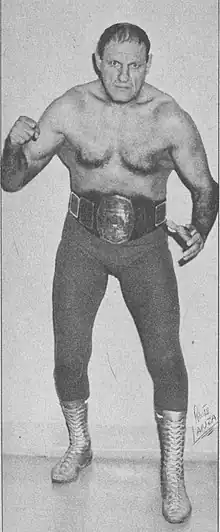 There are several stories of how Spulnik became a wrestler. The most common one is that while attending the University of Detroit (some sources say Assumption College in Windsor), he heard that there was an opportunity to make good pay by wrestling. He was only being paid $50 a week at the Ford plant and was told he could make more as a wrestler.[8] Since he already had an athletic build, he decided to give wrestling a try and began attending a wrestling school.[7][9] When he first wrestled professionally, he was known as "Tarzan Kowalski",[10] but was also called Hercules Kowalski, Killer Kowalski (this nickname is used as early as 1950) and even The Polish Apollo, according to newspaper reports from 1950 to 1951. During the Cold War his name was changed to Wladek Kowalski, which was supposed to sound more menacing.[11] Kowalski wrestled from 1947 to 1977 in a number of organizations, including the National Wrestling Alliance (NWA) and American Wrestling Association (AWA) as a heel.