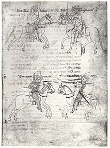 An early illustration of a mythologized Theodoric killing Odoacer in a joust. From the Chronica Theodericiana (1181).