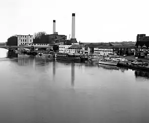 The A station eventually closed in 1959. A new 'B' station was planned before World War II, opening in 1948. The Thames was used both for coal supply and ash removal, and as a source of cooling water.[2] The new station was the first to be opened following nationalisation of the power industry, with the official opening by King George VI, the first station to receive such an honour since Barking in 1924.[3][4]