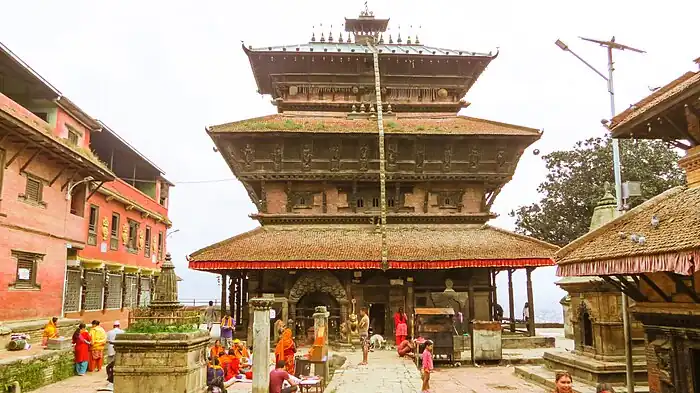 Uma Maheshwar temple (locally, Kwacho Dega) is one of the important heritage sites of Kirtipur. This pagoda-style three-storied temple is situated at the highest point (1414 m) of Kirtipur. Since this temple is at the top of the hill, one can enjoy picturesque view of the Kathmandu valley and mountains like Langtang, Dorge Lakkpa, Chobhu Bhamure, and Gaurishankar.[14]