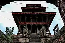 There are eighteen pinnacles: one on the first roof, six on the middle and eleven on the top. Beneath the eaves of the first roof there are very old but faded murals depicting the stories of Ramayan. Maha Bharat and the various manifestations of Durga, the mighty goddess. These paintings are frescoes in red with white plaster background. At the right side of the main gate of the temple there is Hifa Dyo, the god of blood sacrifice is allowed directly to Bagh Bhairab, all animal offerings here are made to this deity just like the animal sacrifices are made to Kumari, a stone idol, placed at the second gate in the left side of Chandeswori in Banepa and to the Chhetrapal which is at the very beginning of the final series of the steps to the temple of Khadga Jogini in Sankhu.[12]