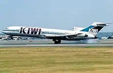 Kiwi flew its first revenue flights on September 21, 1992, using two refurbished Boeing 727-200s from Lufthansa on routes between Newark and Atlanta, Chicago and Orlando.[11] Kiwi offered gourmet meals and expanded legroom with a 36-inch pitch in their airplanes. At start-up, ownership of KIWI was divided among Kiwi's founders and certain of its employees. According to the DOT (Docket #48056 July 1992) at Start-Up, Founders and brothers Dr. Codie Bell and David Bell owned approximately 47% of the airline's stock.[9] The remainder of Kiwi's stock was spread among a number of other individuals.