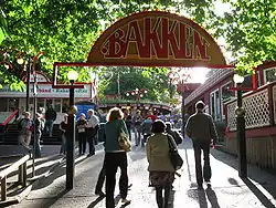 Klampenborg is the main gateway to the extensive Jægersborg Deer Park, one of the most popular green areas in greater Copenhagen, known for its large deer population, the Hermitage Royal Hunting Lodge and ancient oak trees.[2] The entrance, one of many, is adjacent to Klampenborg Station and is marked by a red-painted wooden gate. Adjoining the park is the oldest operating amusement park in the world, Dyrehavsbakken,[3] also located near the station.