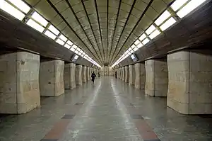 Designed by architects A. Krushinskiy, L. Kachalova, O. Cherevko and M. Solyanyk the station is a standard pylon trivault, but with aesthetics resembling the metallic Prague Metro stations, rather than the traditional marble-clad Soviet ones. The emphasis was to give the station monumentalism, which is achieved by giving a bright high contrast gleam to the appearance. The vault ceilings are covered by set of green aluminium planes. Highly contrasting with this are the black niches which hold a line of powerful fluorescent lighting elements. White marble is used for the walls.