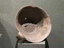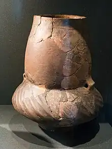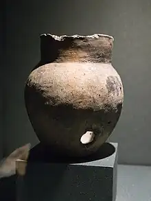 The predominant funeral rite of the Knovíz culture is cremation, which is found in the earliest graves, and is also found less commonly in the preceding Tumulus culture. Burials typically take the form of a flat grave without a covering mound, with remains placed in a pit and usually in a single urn, which is often an amphora-shaped container. In some urns, a hole was pierced, which was probably related to the conception of the afterlife, perhaps an "opening for the soul".[45] In addition to cremation graves, skeletal inhumations are also found,[2] which are an "exceptional phenomenon", and appear to have been reserved mostly for men, sometimes children, and rarely women.[46]