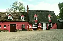 There are seven Grade II listed buildings in Knowl Green. Hole Farmhouse is an early 19th-century timber-framed house at the north of the junction, with, 44 yards (40 m) to the south, an associated timber-framed and weatherboarded late 19th-century cartshed.[4][5] Woodbarn's Farmhouse, at the south of the junction, is a timber-framed and plastered house dating to the 15th century.[6] At the west of the hamlet on Belchamp Road are two conjoined two-storey 18th-century cottages, timber-framed, with brick corners and flint infill.[7] At the east of the hamlet at the north side of Gage's Road is a 17th-century timber-framed thatch-roofed cottage.[8] Opposite, and set back at the south of the road is a further 17th-century timber-framed thatch-roofed cottage.[9] Near this cottage, and on Gage's Road, is The Cherry Tree Inn, timber-framed and plastered, and with gable dormers, dating to the late 17th century, with a 20th-century extension.[10]
