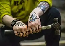 A knuckle tattoo is a kind of tattoo that most commonly uses two groups of four-letter words or one eight-letter word.[1] It is not necessarily a prison tattoo, as sometimes believed, but remains an unpopular form of tattoo—alongside hand tattoos in general—due to the difficulty of hiding it in situations such as a formal setting where it would be seen as crass.[2] Some people also use their knuckles to tattoo drawings and images, sometimes in groups of four, such as the four symbols of a deck of playing cards to signify good luck, or astrological symbols.