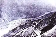 Another notable surge started on September 28, 1969. Because its onset occurred during a colder season with minimal presence of meltwater in the glacier's basin, the event was not catastrophic. By October 4, Kolka's tongue again reached the Maili glacier, having moved 1.3 km. After a month of relative calm, the glacier was on the move again by the beginning of November. A mass of fractured ice, 100–130 m thick, blocked the Upper Karmadon Springs and moved into the upper parts of the Genaldon valley, travelling at 20–50 m per day. By January 1970 it had stopped but, by then, the glacier had extended its length by 4.1 km and descended 800 m.[3]