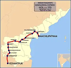 The 17211 / 17212 Kondaveedu Express train belonging to Indian RailwaysSouth Coast Railway zone is a tri-weekly train that runs between Machilipatnam and Yesvantpur Junction in India. The train is named after the Kondaveedu Fort near Guntur City.