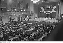 It is often claimed that the building served as a military hospital during the First World War - however, this cannot be proven and is considered rather unlikely.[1] After the war, the house was once again a social meeting place in Leipzig. There was only minor damage during the Second World War, which was soon repaired. In 1947, the Congress Hall was reconstructed and rebuilt (widening of the tiers, lower ceiling, installation of a stage). It thus became the most important social hall in the city of Leipzig.[4]