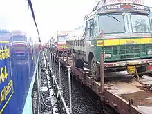 RORO means Roll-on/roll-off, where loaded trucks are directly carried by railway wagons to their destination. The first ever RO-RO service in India was run by Konkan Railway. Konkan Railway passes through tough terrains of India. There is NH-66 passing through same route. Truck drivers find it extremely difficult to drive loaded trucks through ghats, undulating surfaces, narrow roads and poor road and weather conditions. The KRC came with concept of RORO, where loaded trucks are moved on wagons and are travelled by train. This has helped in saving fuel, decrease in wear and tear of lorries (trucks), relief to drivers of driving in extreme conditions, and faster arrival of the trucks to destination. This also helps decrease road congestion and pollution. This concept has been beneficial for both truck operators and KRCL.